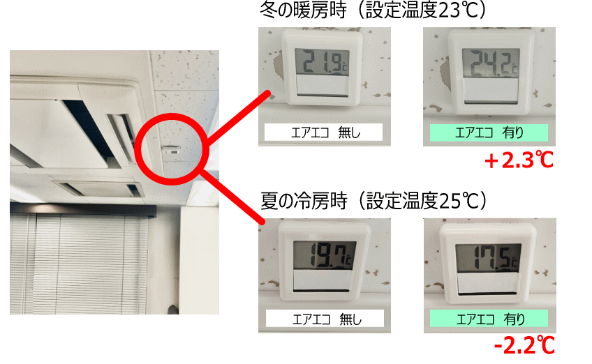 エアエコを設置することで、エアコンの吹き出し口温度が冷房時には低く、暖房時には高くなります。