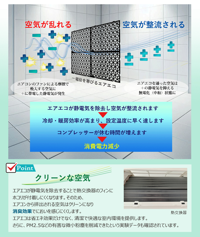 静電気を抑え空気の流れを良くすることで熱交換率をアップ
