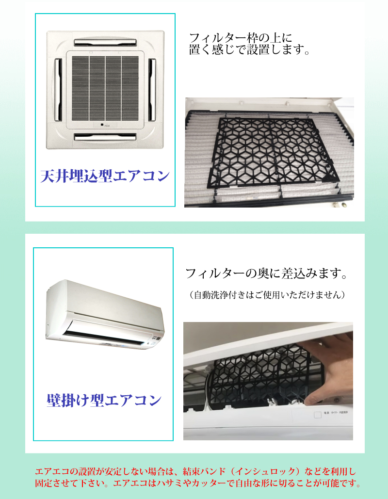エアコンのフィルターの上に置くだけで、空気の流れを阻害したり電気回路に影響を与えるものではありませんので故障することはありません。 |